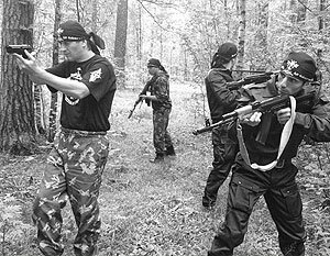 Иван Отраковский (слева) тренирует участников движения «Святая Русь»